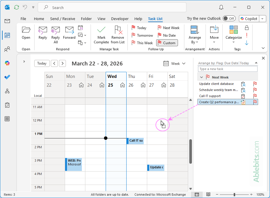 - Drag a task from the To-Do Bar onto a specific day and time in the calendar grid.