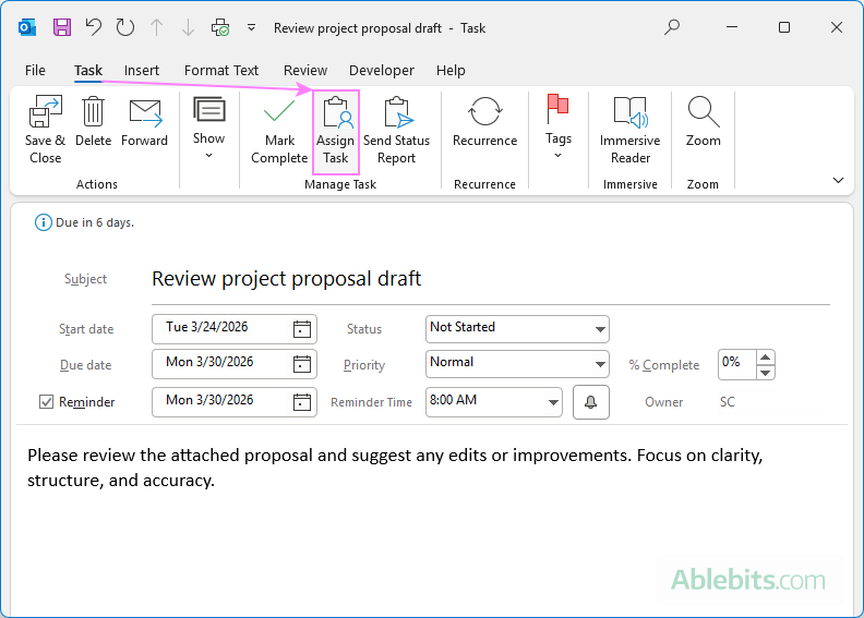 If you've already created a task and later decide to delegate it to someone else, you don't need to start over. Outlook lets you assign an existing task in just a couple of quick ways.