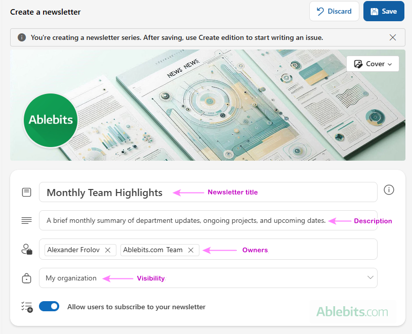 In the new Outlook, newsletters are created as a series that can include multiple editions over time. You start by setting up the series, including its name, visibility, and ownership.