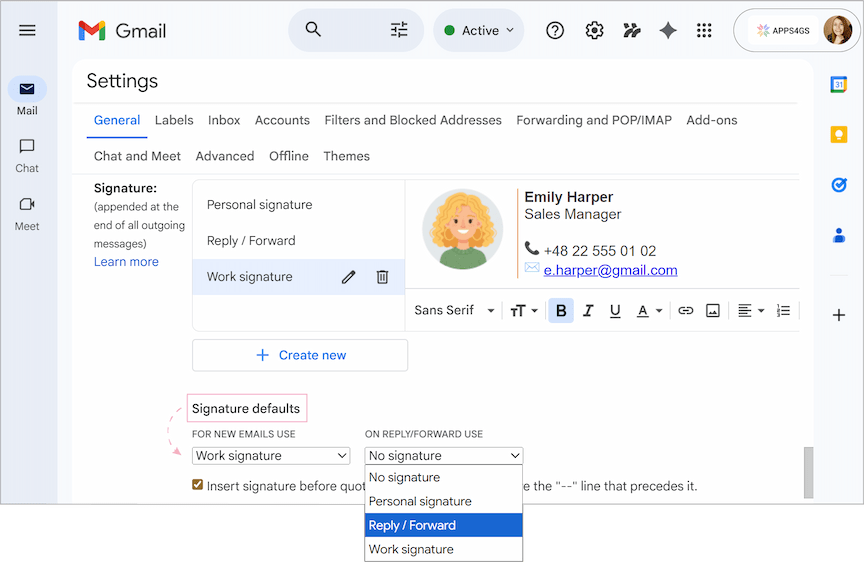 If you want your signature to appear automatically when you write a new email or follow up on a thread, you need to configure your signature defaults. There is no need to create new signatures from scratch if you already have any – you just need to tell Gmail when to use them.