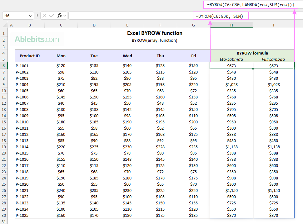 Compared to traditional copied formulas, BYROW has some clear advantages: