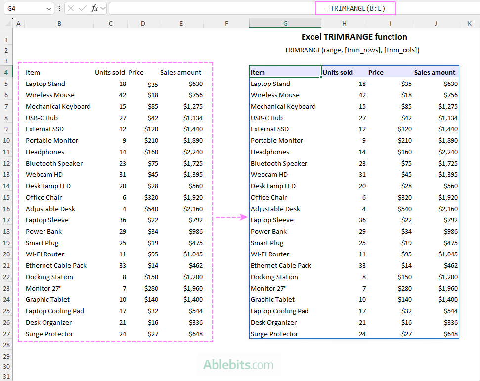 The TRIMRANGE function solves this problem by removing empty rows and columns from the outer edges of a range. The result is a clean, compact array that includes only the cells containing data.