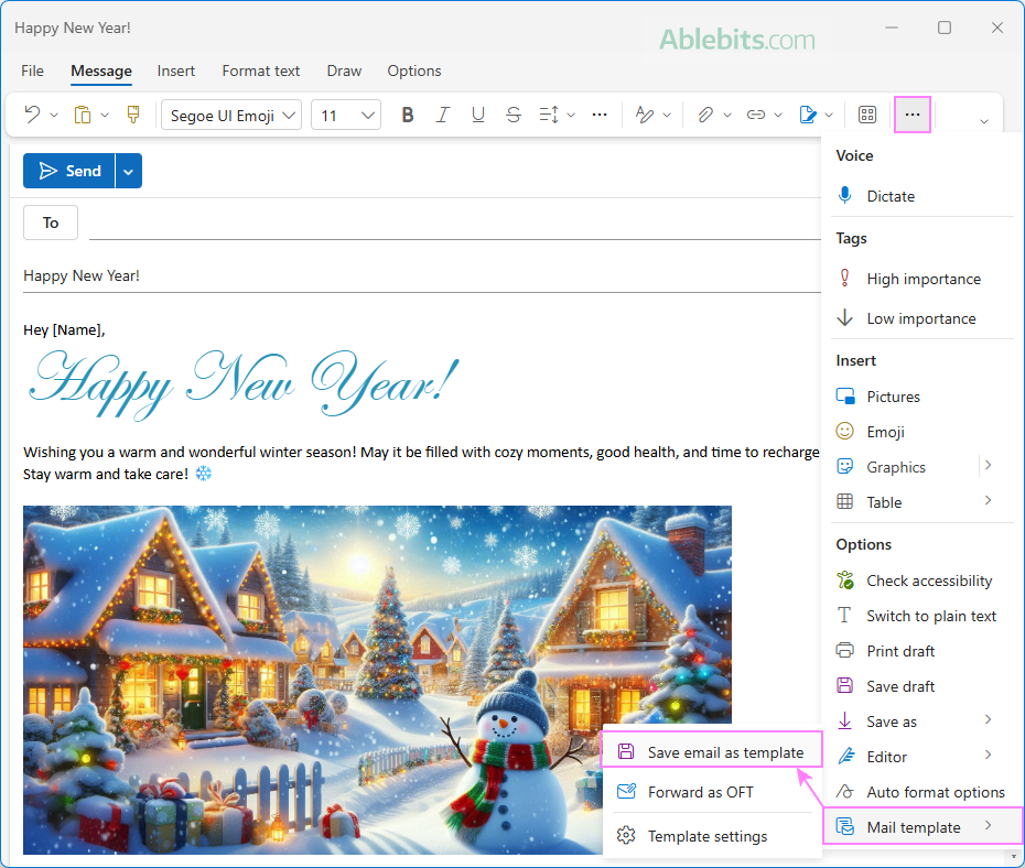 - New Outlook and web: On the Message tab, click More options > Mail template > Save email as template.
