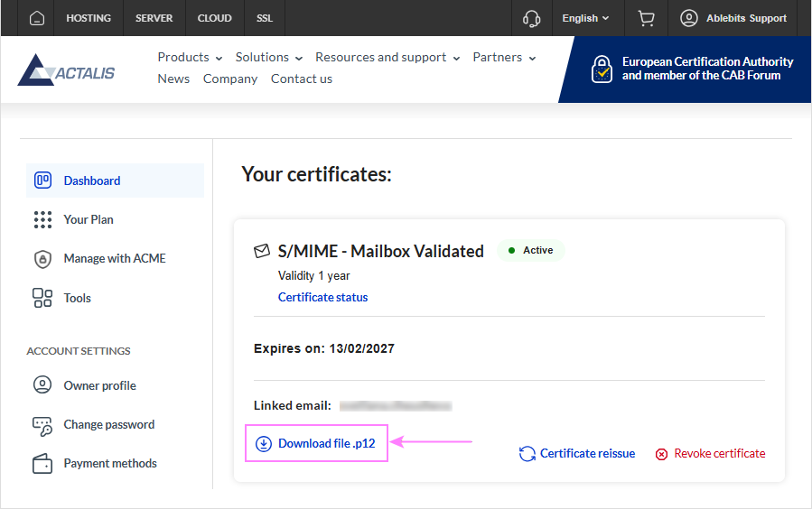 - Private key password. S/MIME cert providers, including Actalis, provide a separate password for opening the private key. Store this password securely. If you lose it, there's no way to recover it, and you would need to request a new certificate.